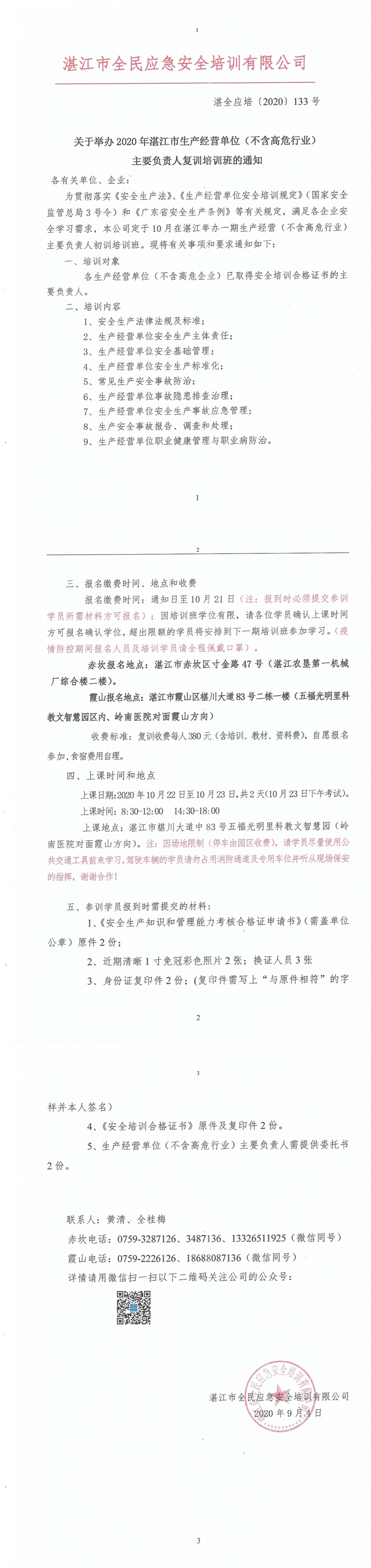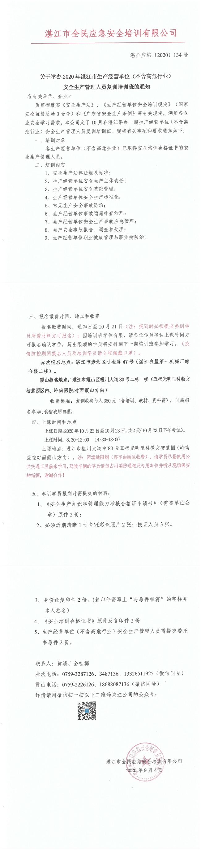 2020年10月22日-10月23日一般企业(非高危行业)复训班