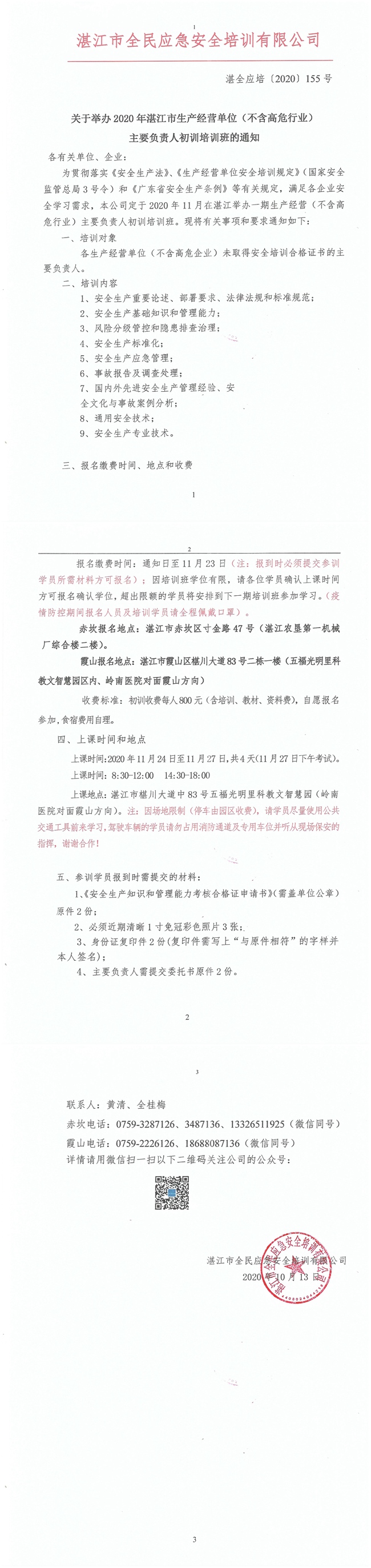 2020年11月24-11月27日一般生产丶经营单位主要负责人和安全管理员初训班