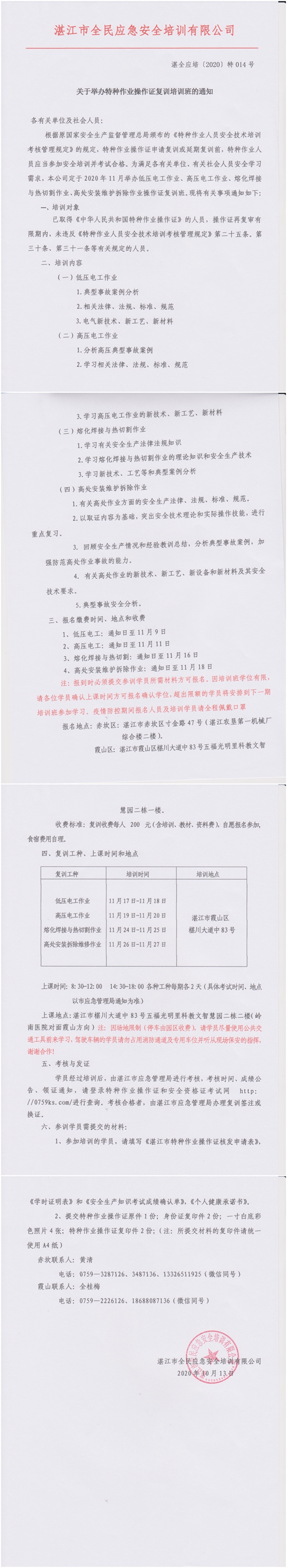 2020年11月17日-11月27日低压电工、高压电工、熔化焊接与热切割和高处安装维护拆除复训班