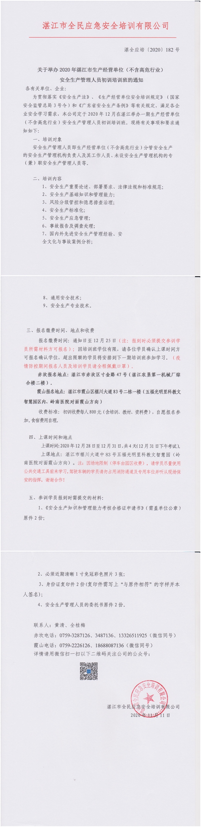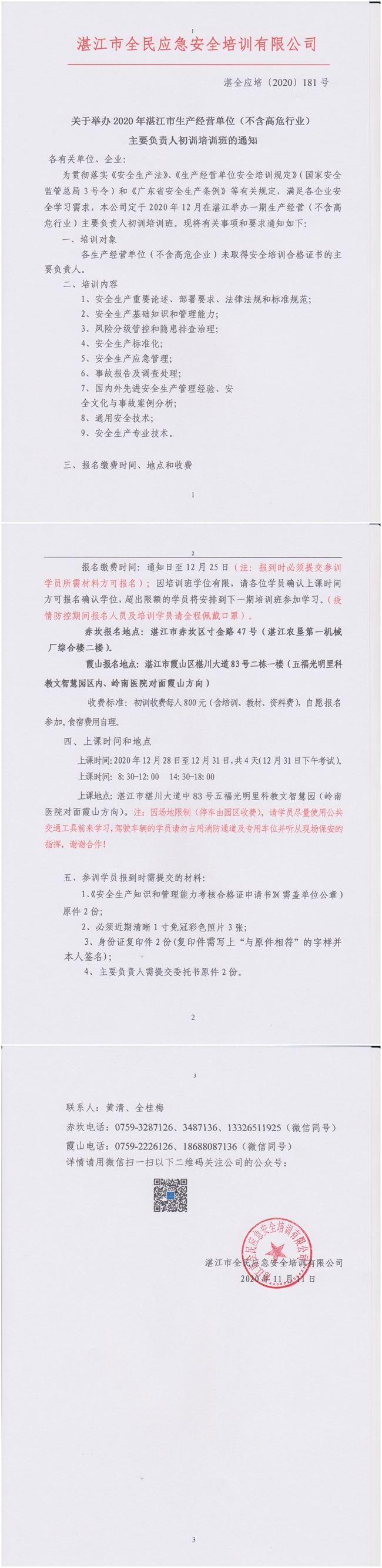 2020年12月28日-31日生产经营单位(不含高危行业)初训班通知
