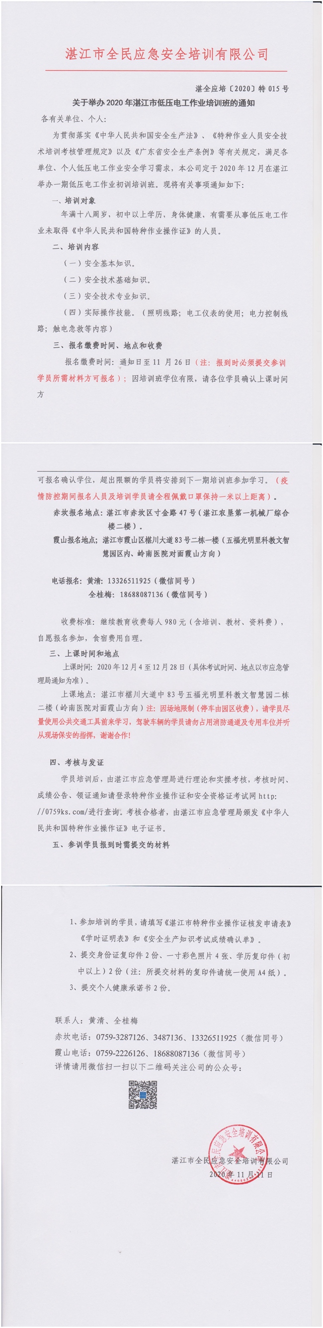2020年12月4日-12月28日低压电工作业初训培训班通知