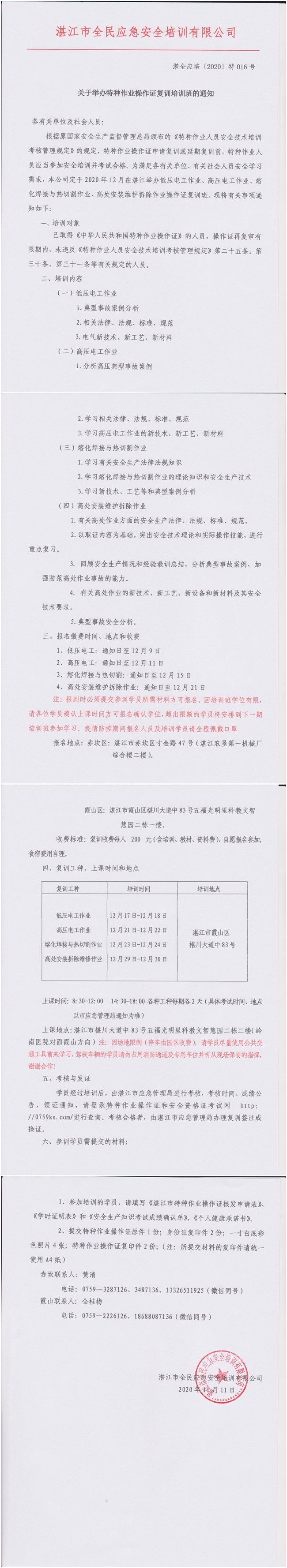 2020年12月17日-12月30日各种特种作业操作证复训培训班通知