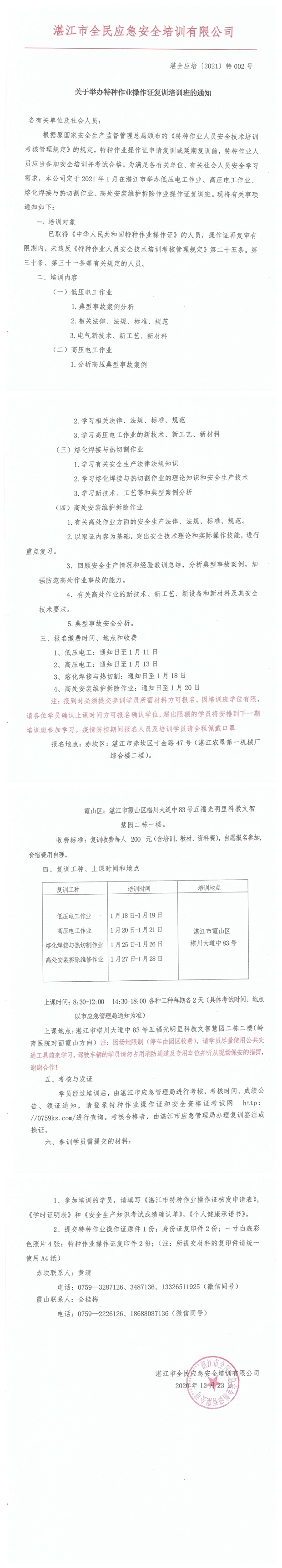 2021年1月18日-1月28日各种特种作业操作证复训培训班通知