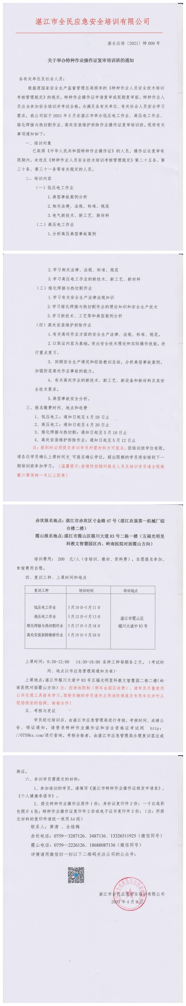 2021年5月10日-5月20日低压电工、高压电工、熔化焊接与热切割作业、高处作业复审培训班通知
