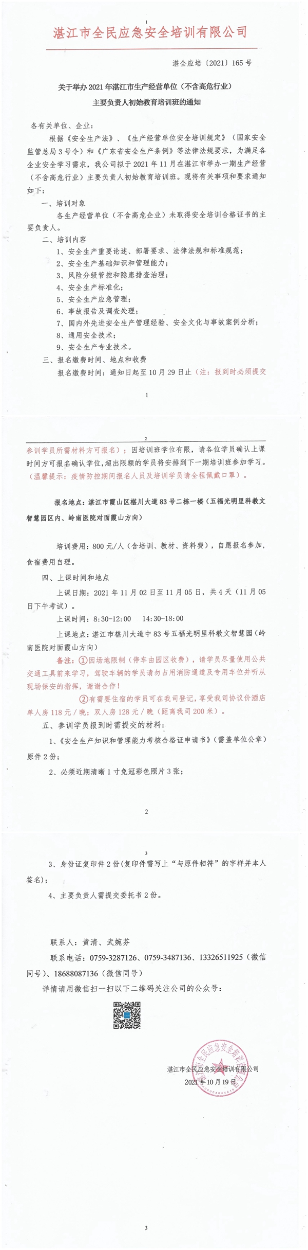 2021年11月2日-11月5日生产经营单位(不含高危行业)主要负责人及安全管理人员初始教育培训班通知