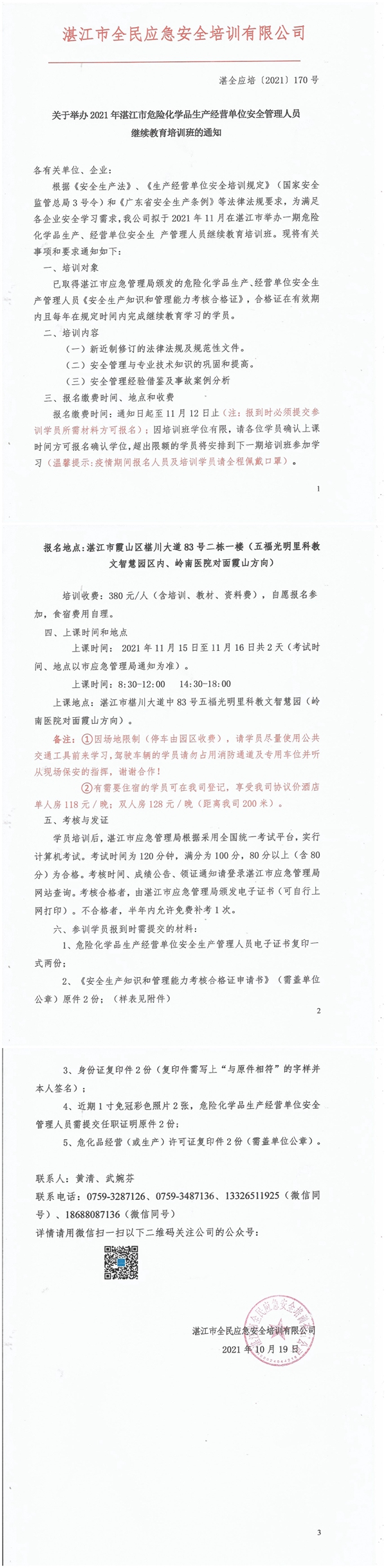 2021年11月15日-11月16日危险化学品生产经营单位主要负责人及安全管理员继续教育培训班通知