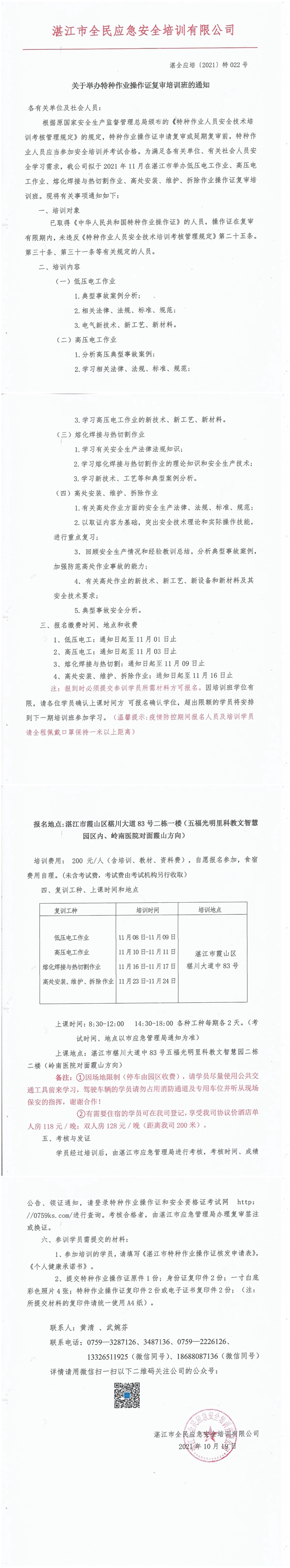2021年11月8日-11月24日低压电工、高处作业、熔化焊接与热切割复审培训班通知