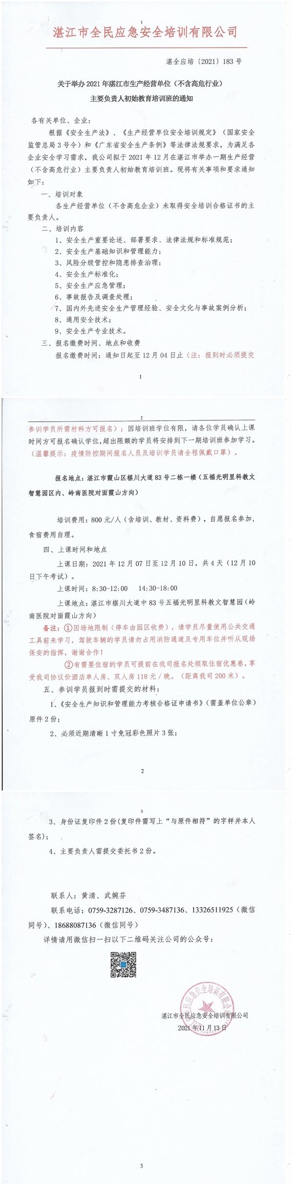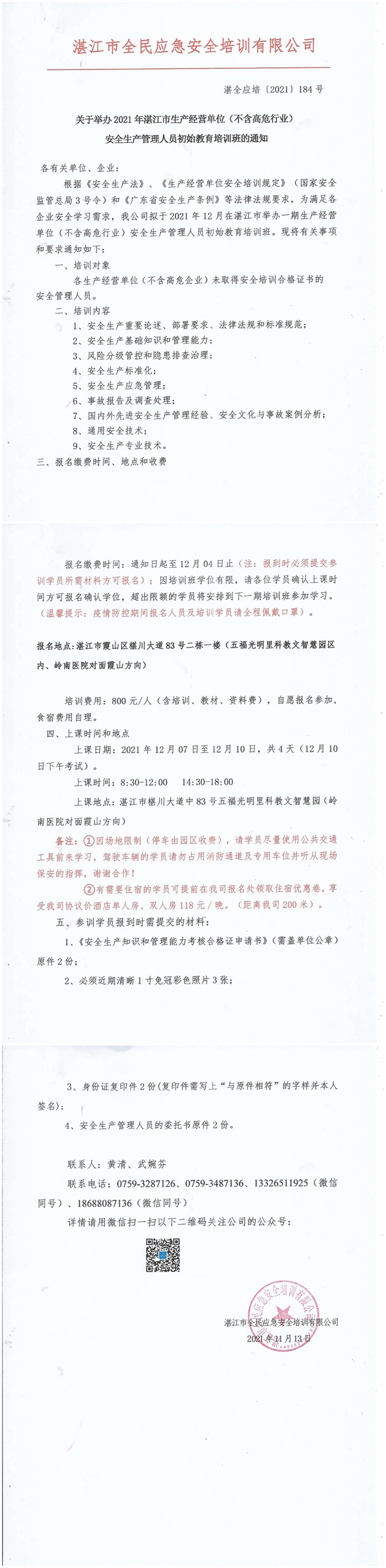 2021年12月7日-12月10日生产经营单位(不含高危行业)主要负责人及安全管理人员初始教育培训班通知