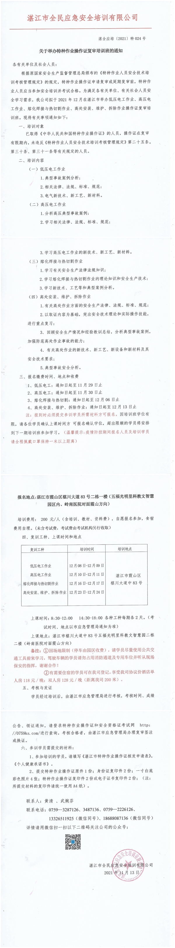 2021年12月8日-12月24日低压电工、高处作业、熔化焊接与热切割复审培训班通知