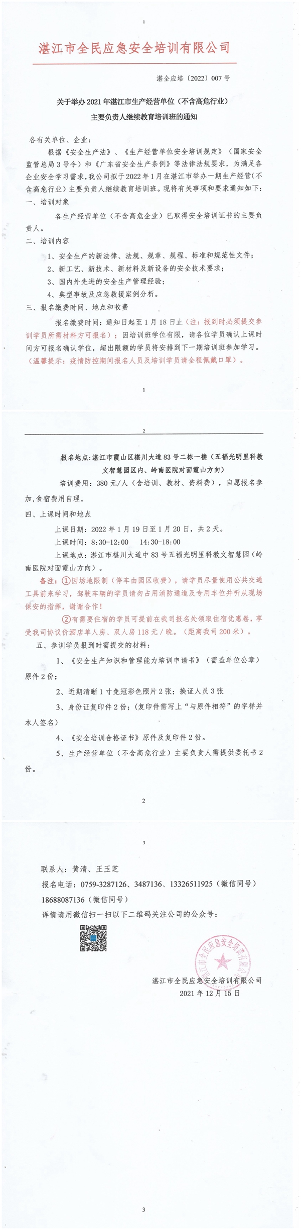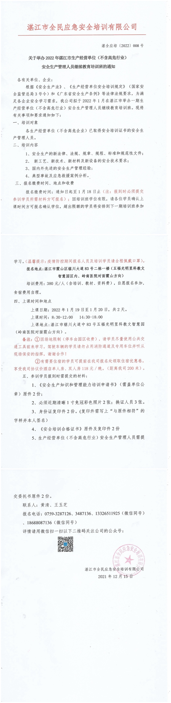 2022年1月19日-1月20日生产经营单位(不含高危行业)主要负责人及安全管理人员初始教育培训班通知