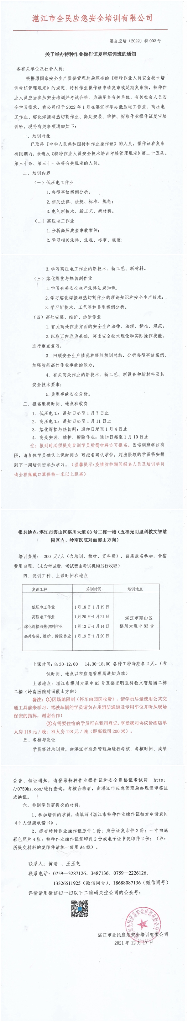 2022年1月13日-1月21日低压电工、高压电工、高处作业、熔化焊接与热切割复审培训班通知