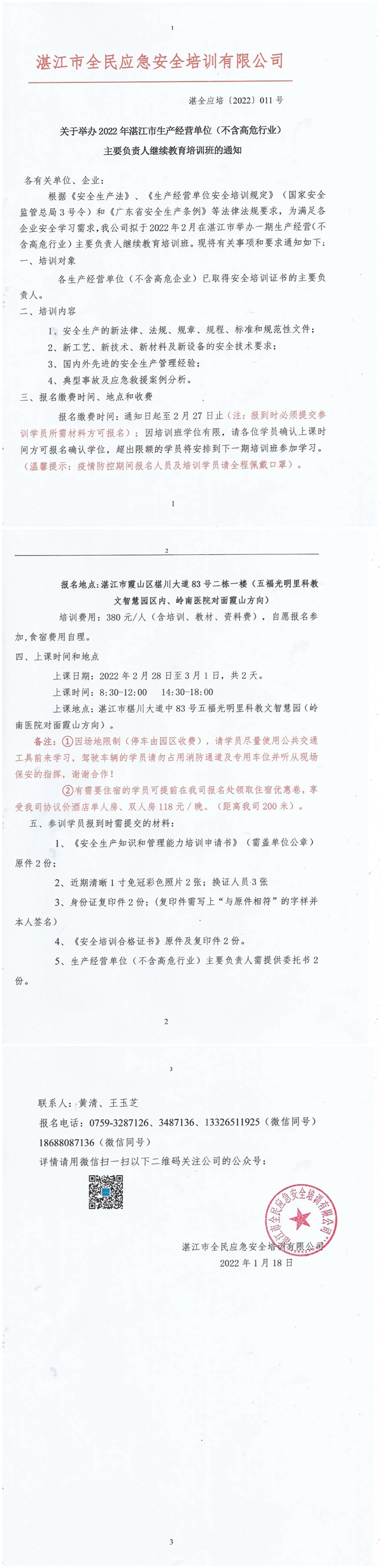 2022年2月28日-3月1日生产经营单位(不含高危行业)主要负责人及安全管理人员继续教育培训班通知