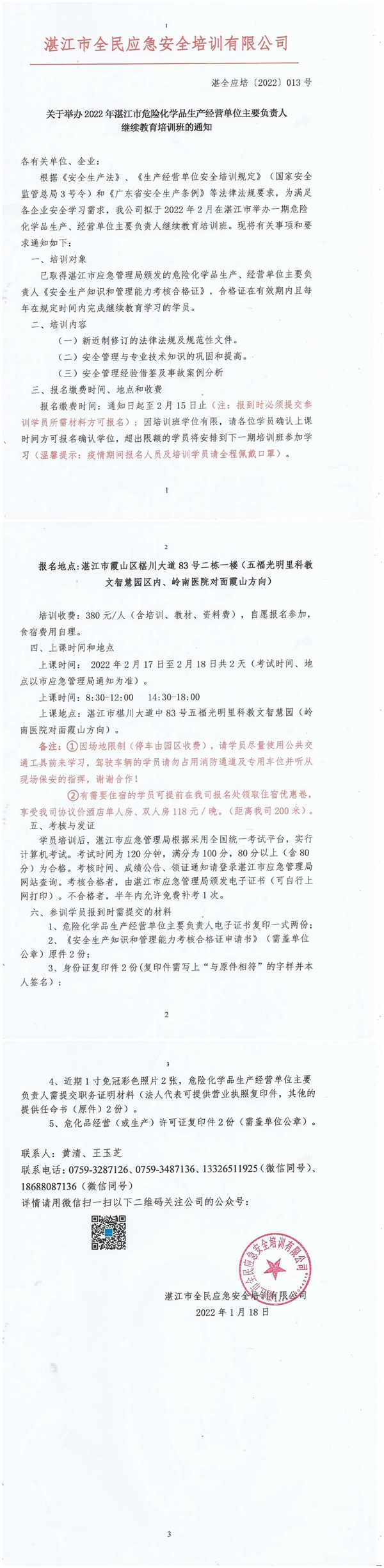 2022年2月17日-2月18日危险化学品生产经营单位主要负责人及安全管理员继续教育培训班通知