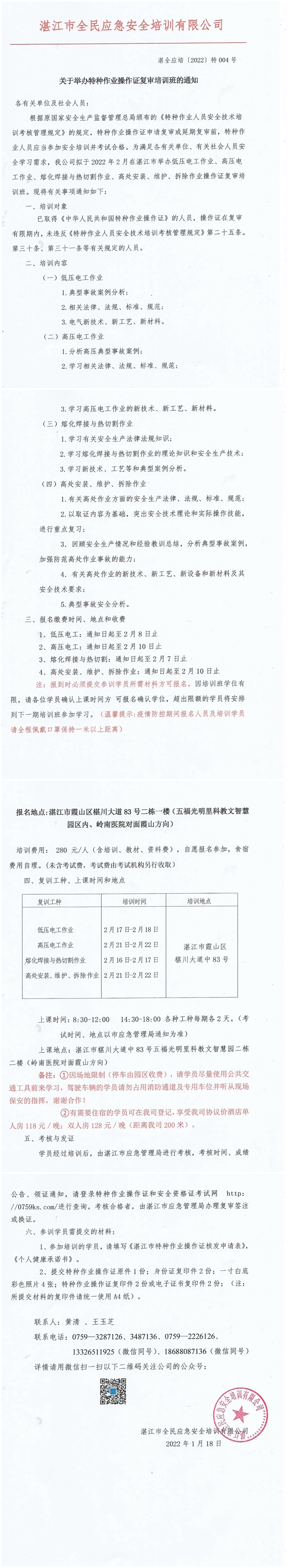 2022年2月16日-2月22日低压电工、高压电工、熔化焊接与热切割作业、高处作业复审培训班通知