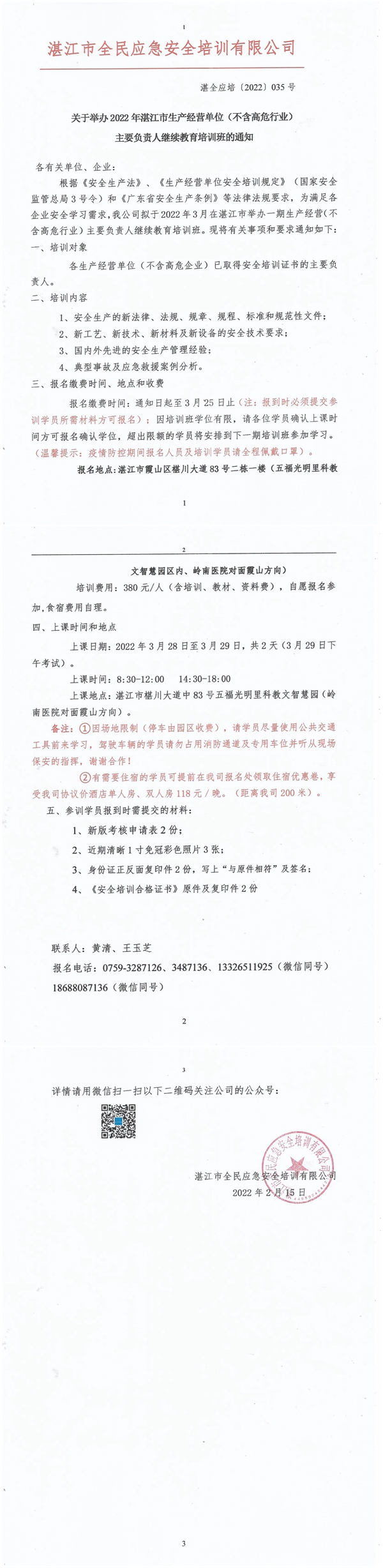 2022年3月28日-3月29日生产经营单位(不含高危行业)主要负责人及安全管理人员继续教育培训班通知