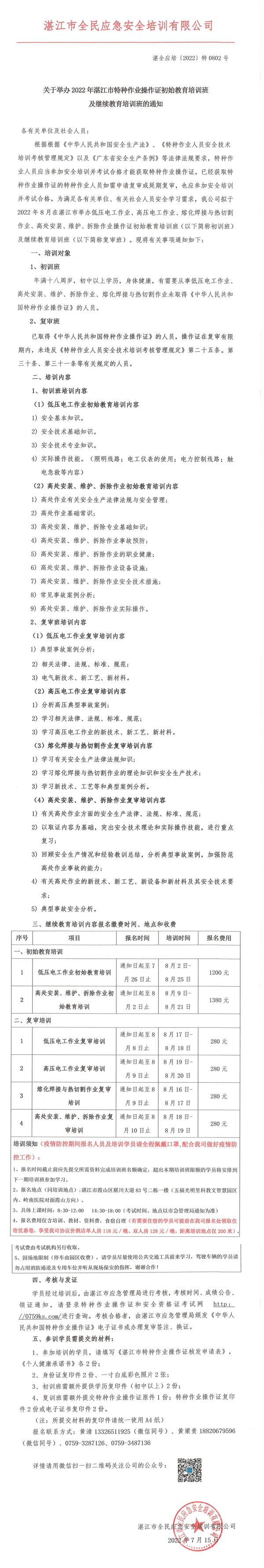 2022年8月低压电工、高压电工、熔化焊接与热切割作业、高处作业初始教育培训班及继续教育培训班的通知