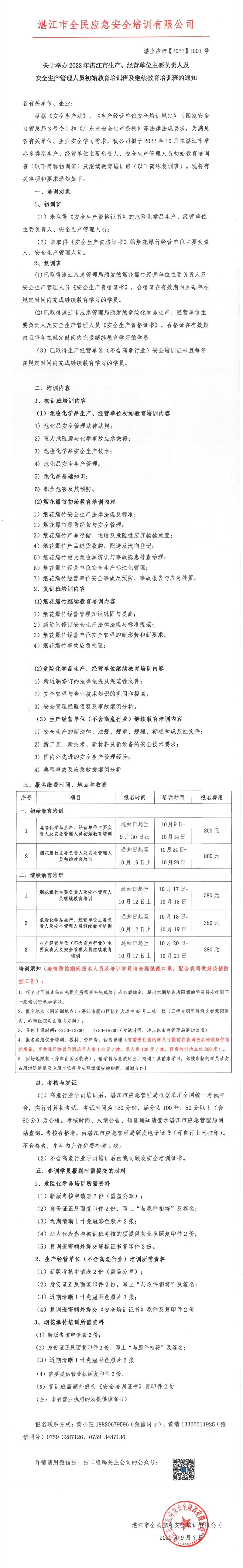 2022年10月湛江市生产、经营单位主要负责人及安全生产管理人员初始教育培训班及继续教育培训班的通知