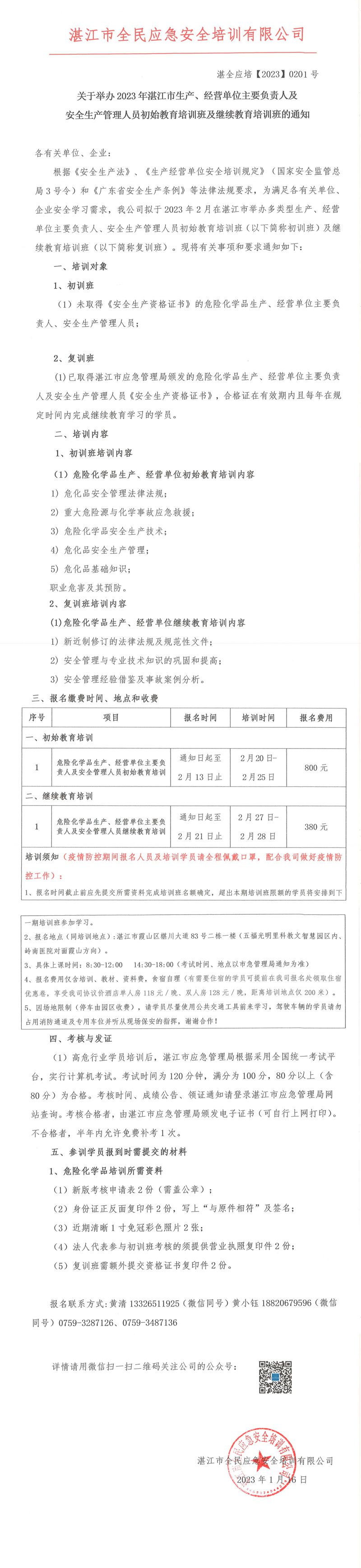 2023年2月湛江市生产、经营单位主要负责人及安全生产管理人员初始教育培训班及继续教育培训班的通知