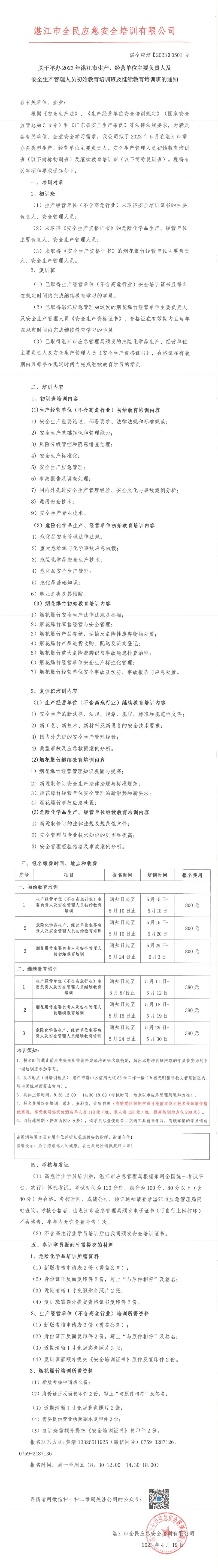 2023年5月湛江市生产、经营单位主要负责人及安全生产管理人员初始教育培训班及继续教育培训班的通知