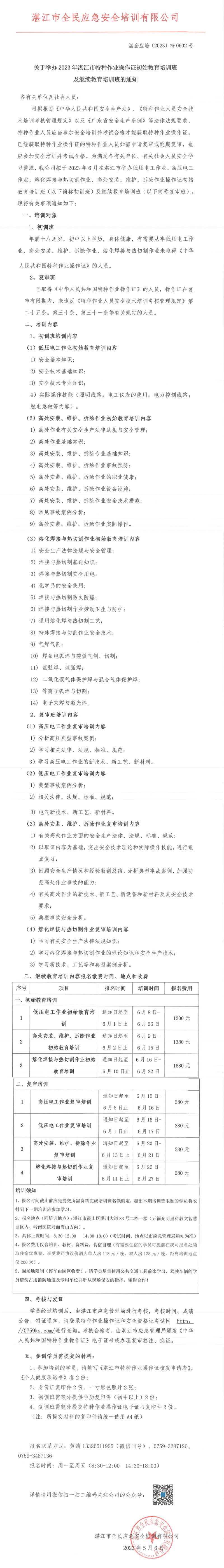 2023年6月低压电工、高压电工、熔化焊接与热切割作业、高处作业初始教育培训班及继续教育培训班的通知