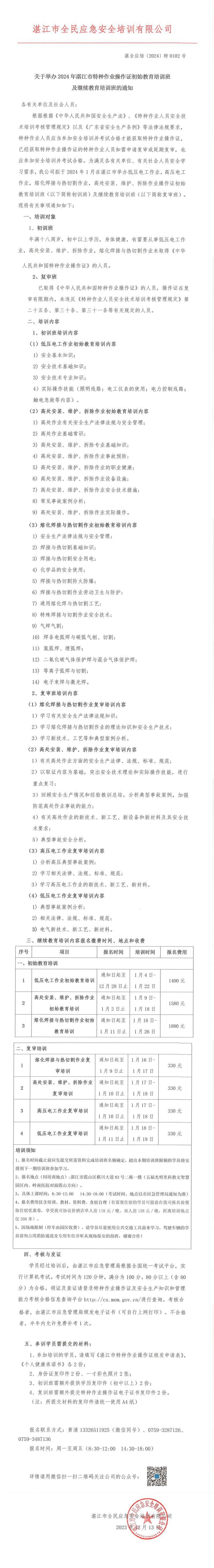 2024年1月低压电工、高压电工、熔化焊接与热切割作业、高处作业初始教育培训班及继续教育培训班的通知