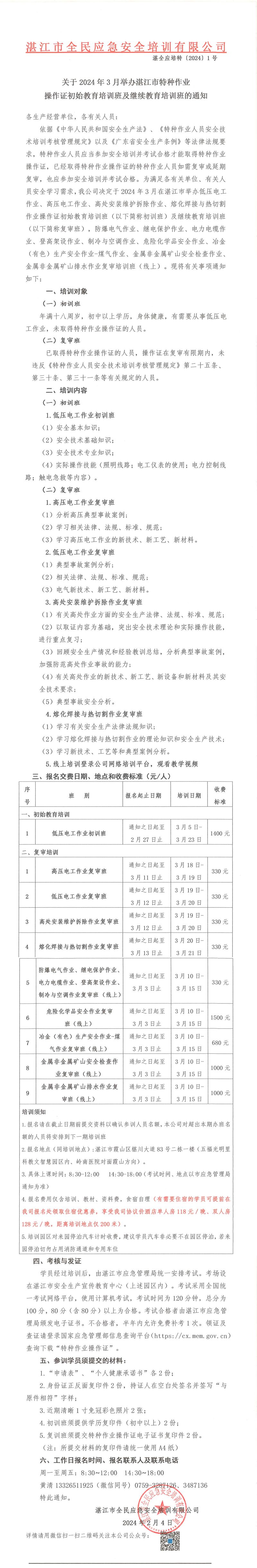 2024年3月低压电工、高压电工、熔化焊接与热切割作业、高处作业初始教育培训班及继续教育培训班的通知