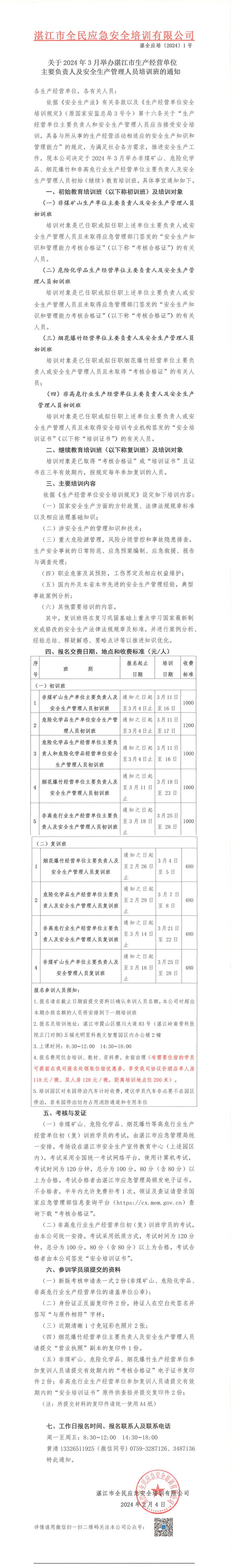 2024年3月湛江市生产经营单位主要负责人及安全生产管理人员初始教育培训班及继续教育培训班的通知