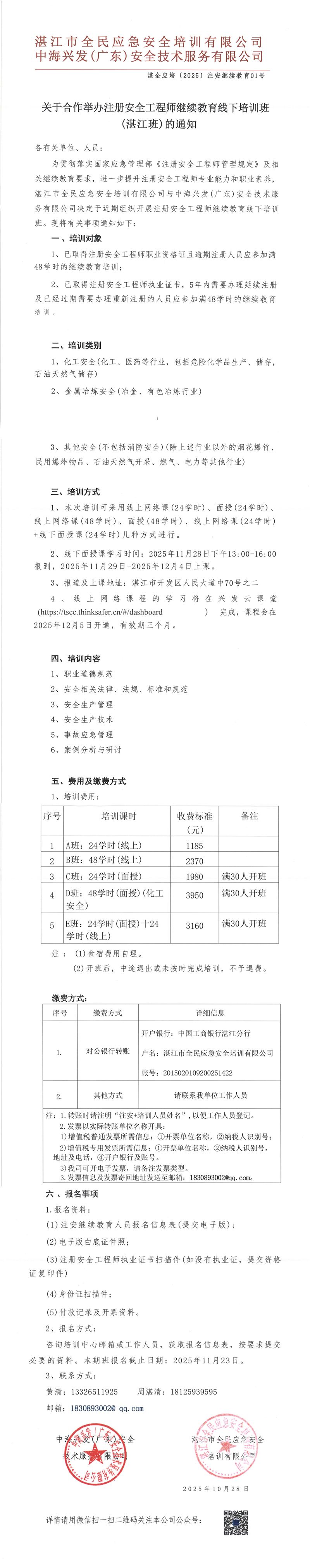 关于合作举办注册安全工程师继续教育线下培训班(湛江班)的通知