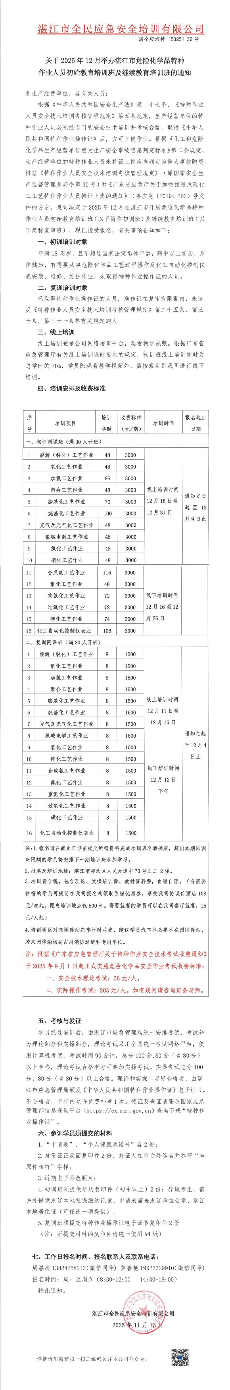 关于举办2025年12月份湛江市危险化学品特种作业初训培训班的通