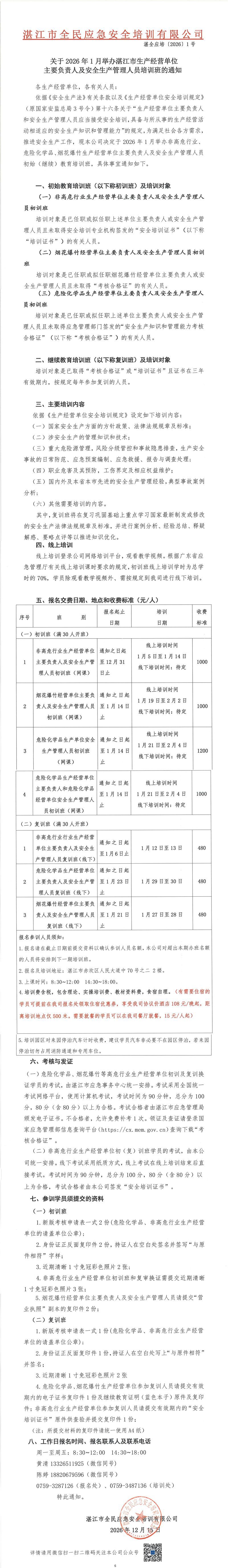 2026年1月湛江市生产经营单位主要负责人及安全生产管理人员培训班的通知