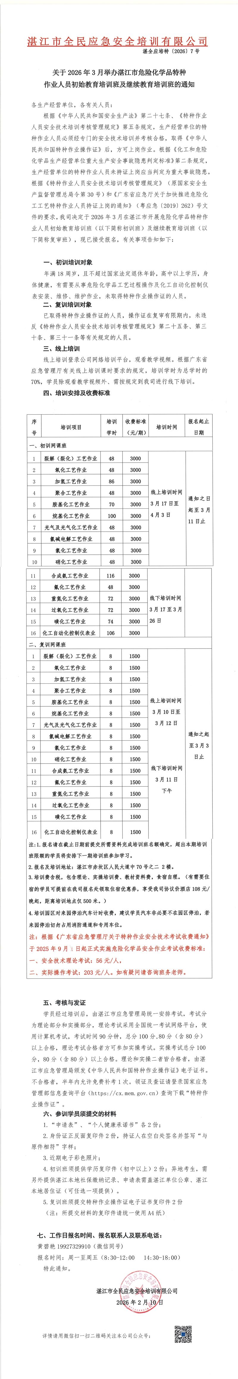 关于举办2026年3月份湛江市危险化学品特种作业初训培训班的通知