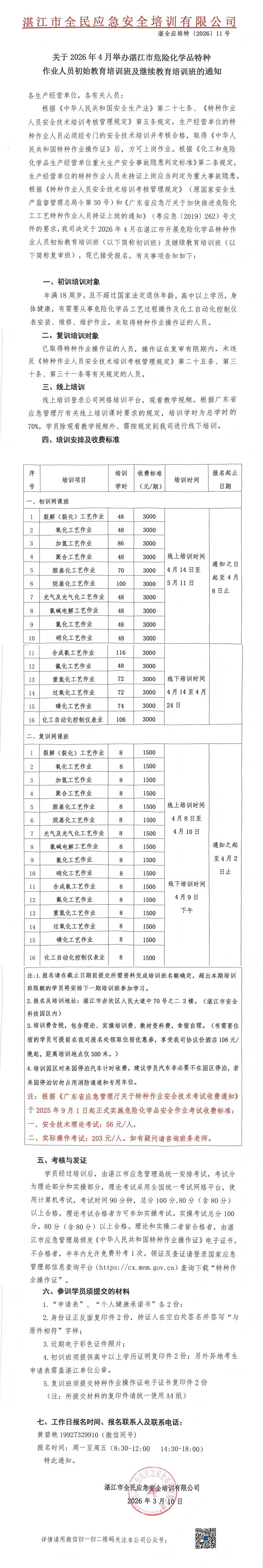 关于举办2026年4月份湛江市危险化学品特种作业初训培训班的通知