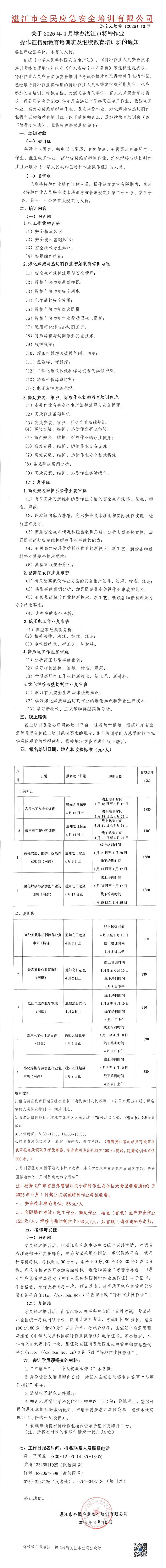 2026年4月高低压电工作业、高处安装维护拆除作业、登高架设作业、熔化焊接与热切割作业初始教育培训班及继续教育培训班的通知