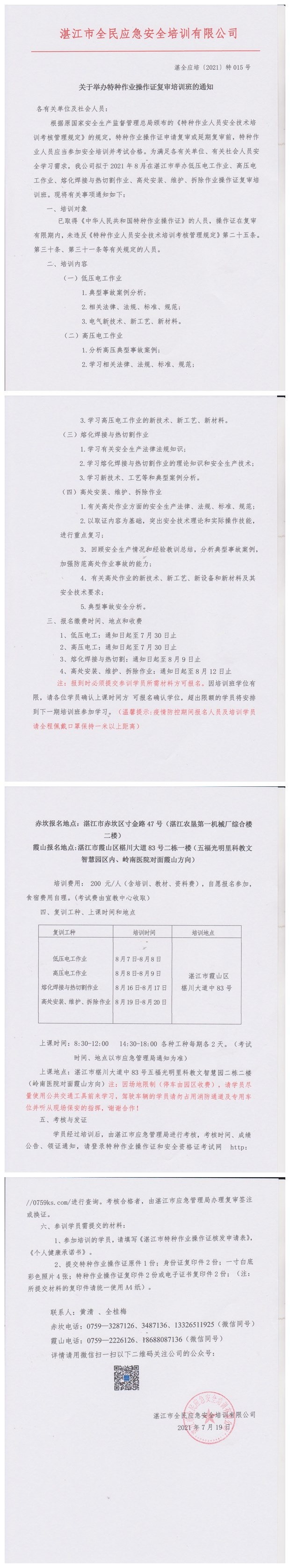 2021年8月7日-8月20日低压电工、高压电工、熔化焊接与热切割作业、高处作业复审培训班通知