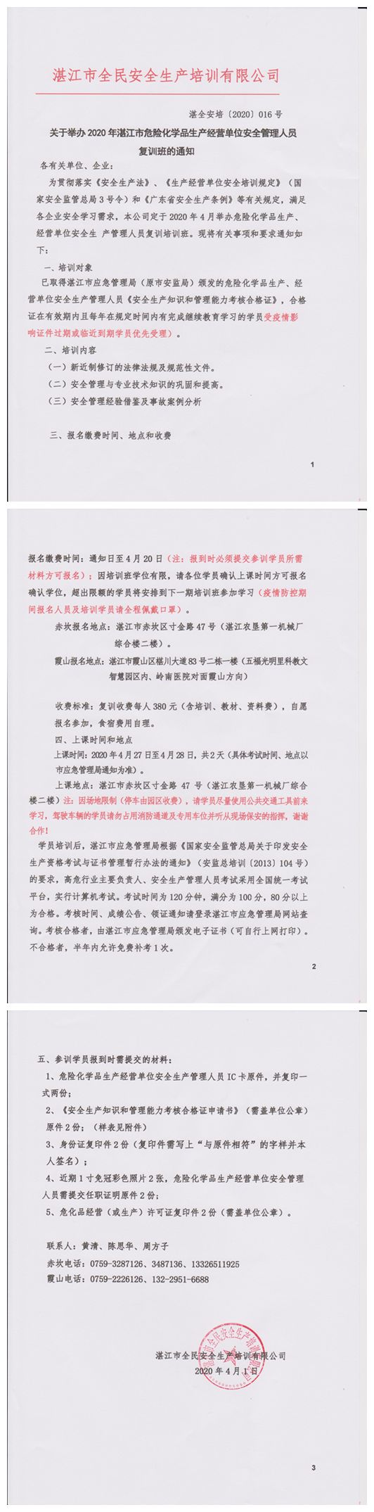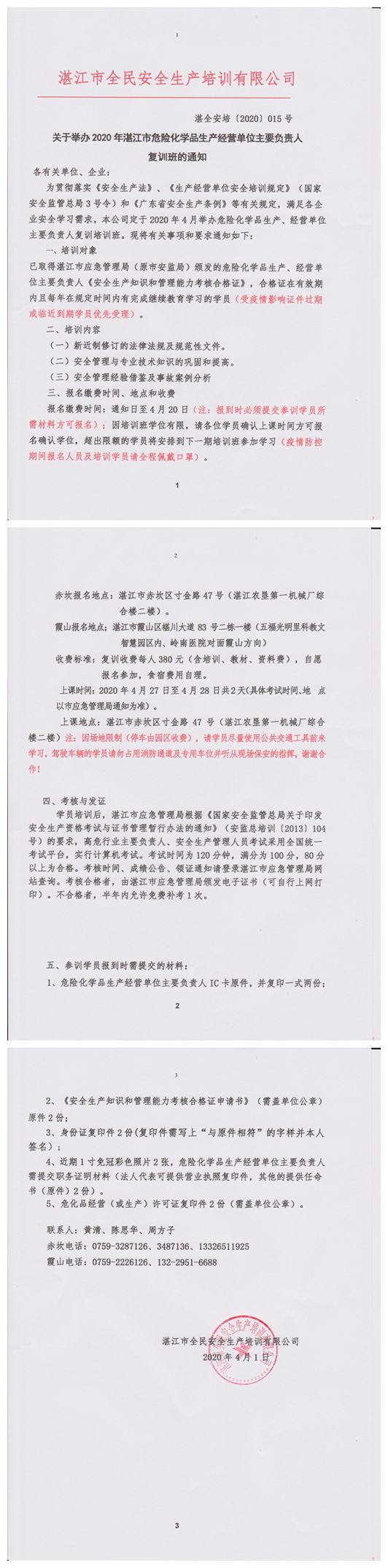 2020年4月27日-4月28日危险化学品复训班通知