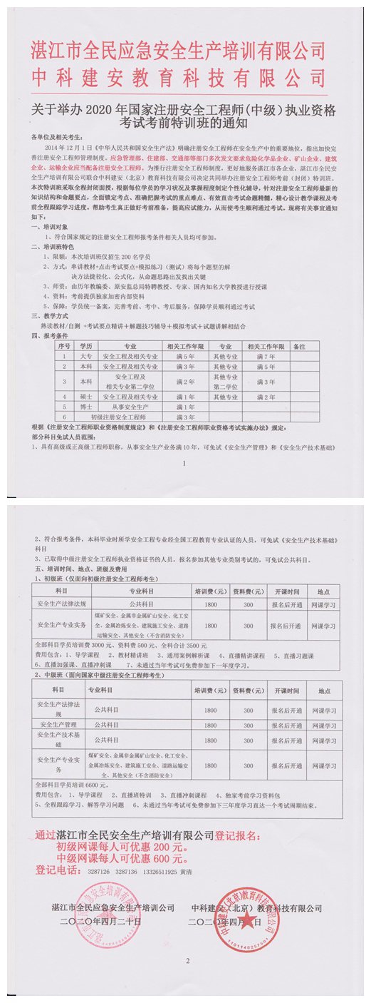 2020年国家注册安全工程师(中级)考前特训班通知