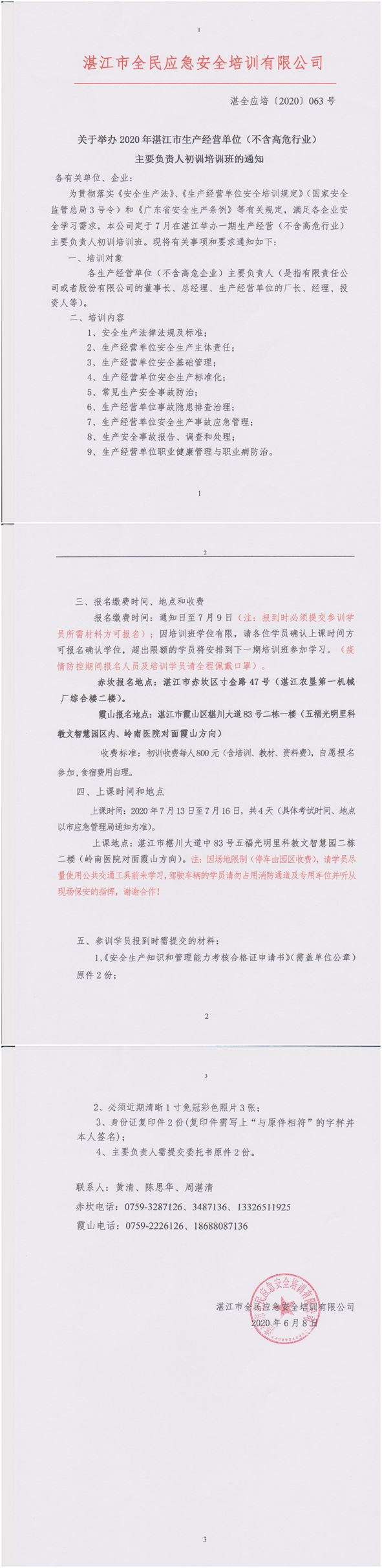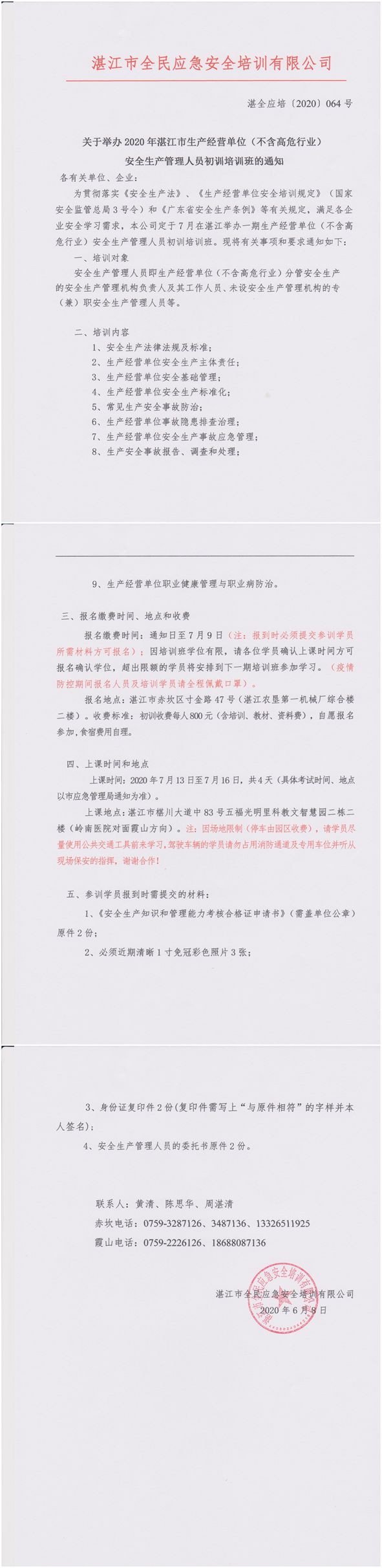 2020年7月13日-7月16日经营单位(不含高危)初训班通知