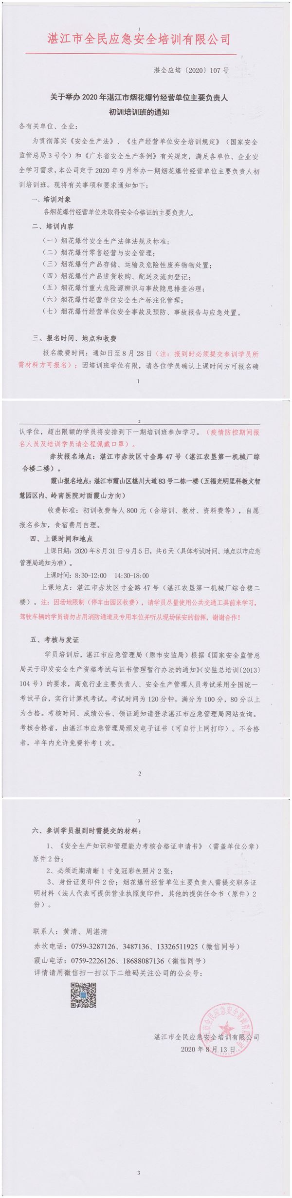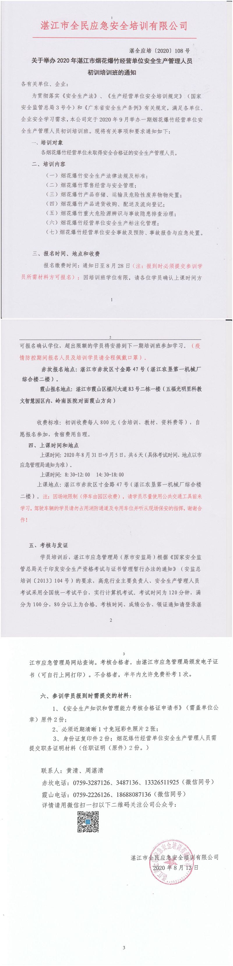 2020年8月31日-9月5日烟花爆竹经营单位主要负责人及安全管理人员初训班