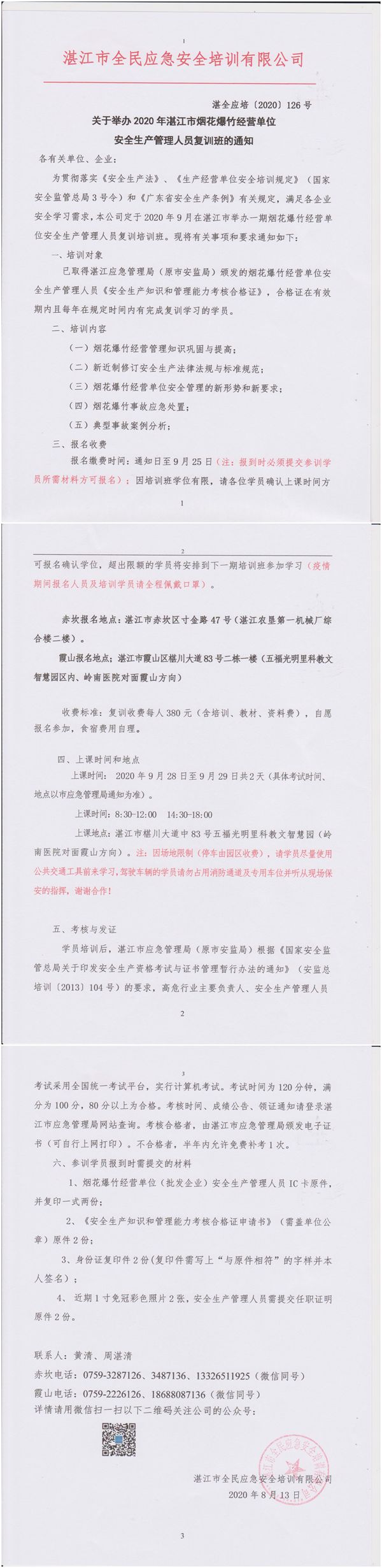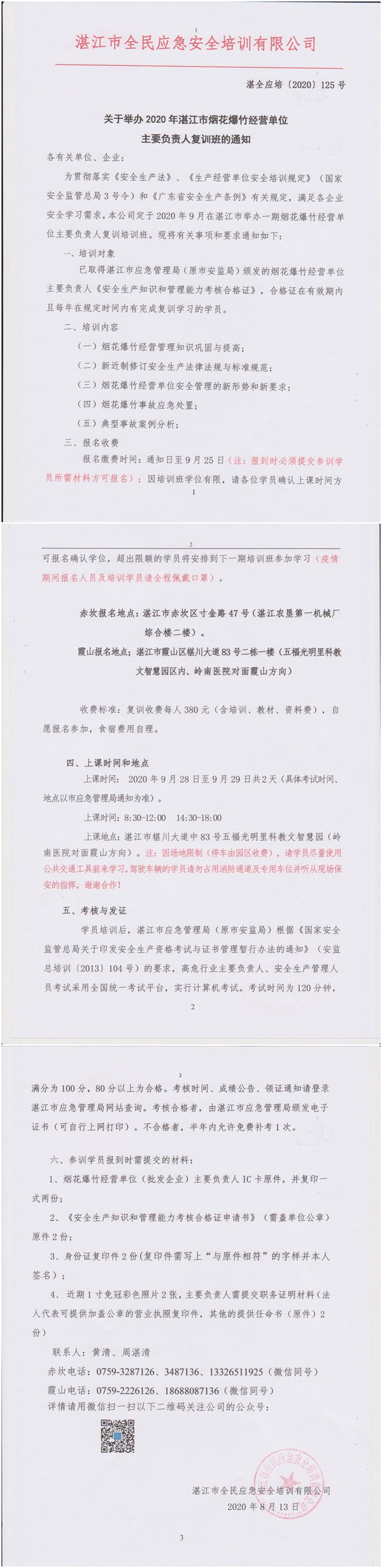 2020年9月28日-9月29日烟花爆竹经营单位主要负责人及安全管理人员复训班