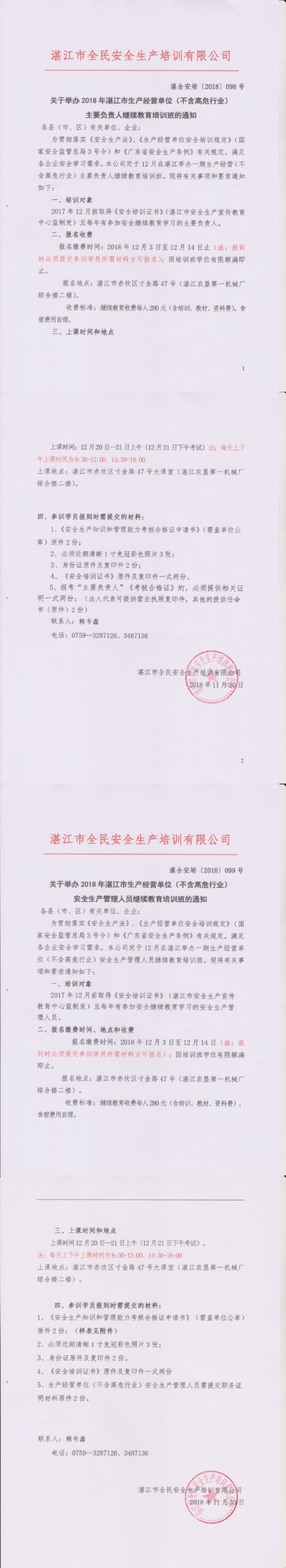 2018年12月20-21日生产经营单位(不含高危行业)继续教育培训通知