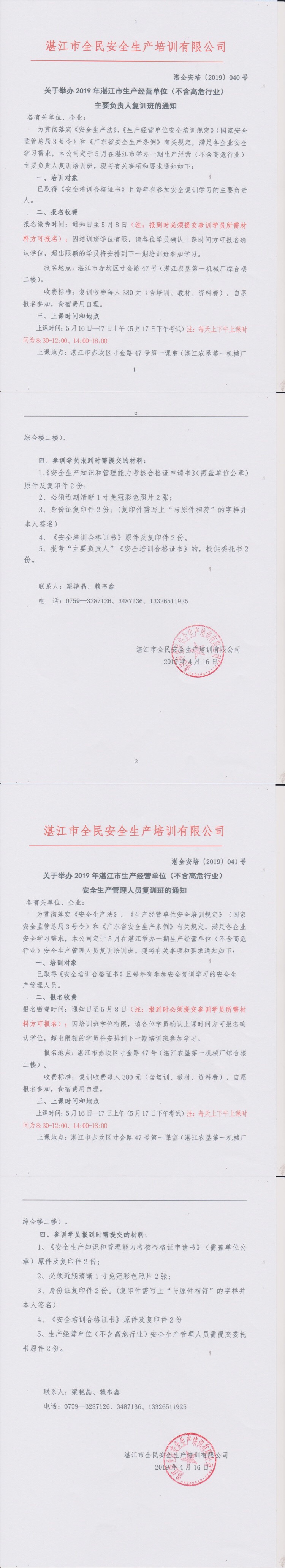 2019年5月16日-17日生产经营单位(不含高危行业)复训通知