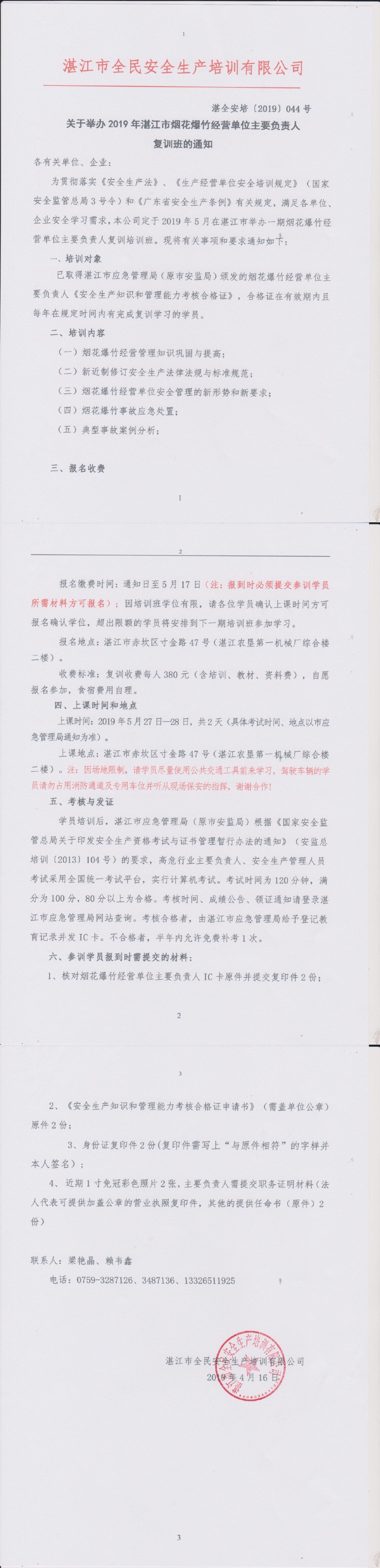 2019年5月27日-28日烟花爆竹经营单位复训通知
